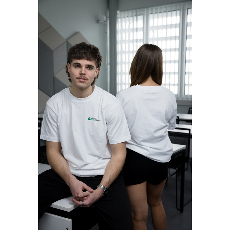 Reet Ausi naiste valge up-shirt rohelise noolega.